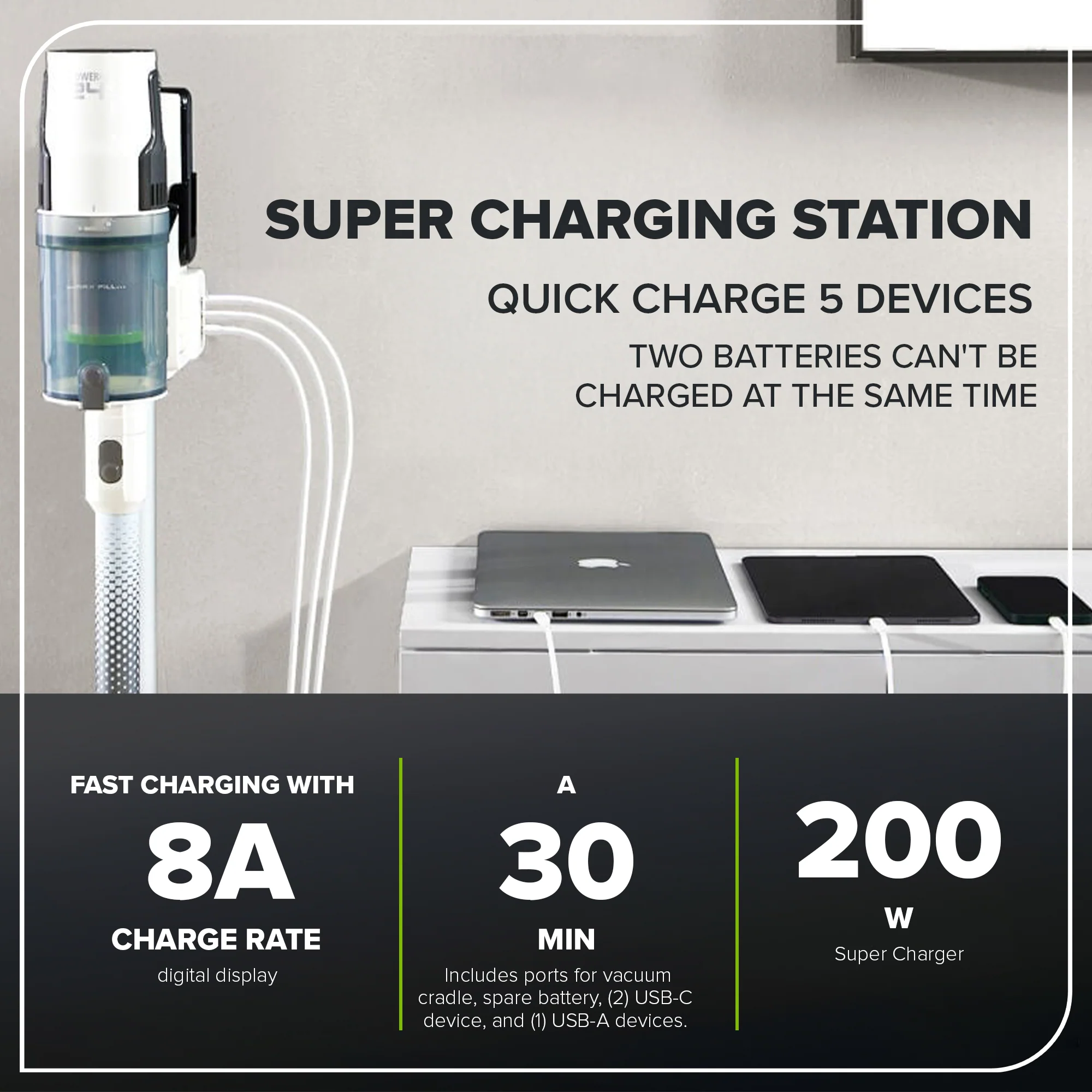 200W Super Charger: Fast charging with 8A charge rate, digital display, and a 30-minute charge time estimate. Includes ports for vacuum cradle, spare battery, (2) USB-C device, and (1) USB-A devices.