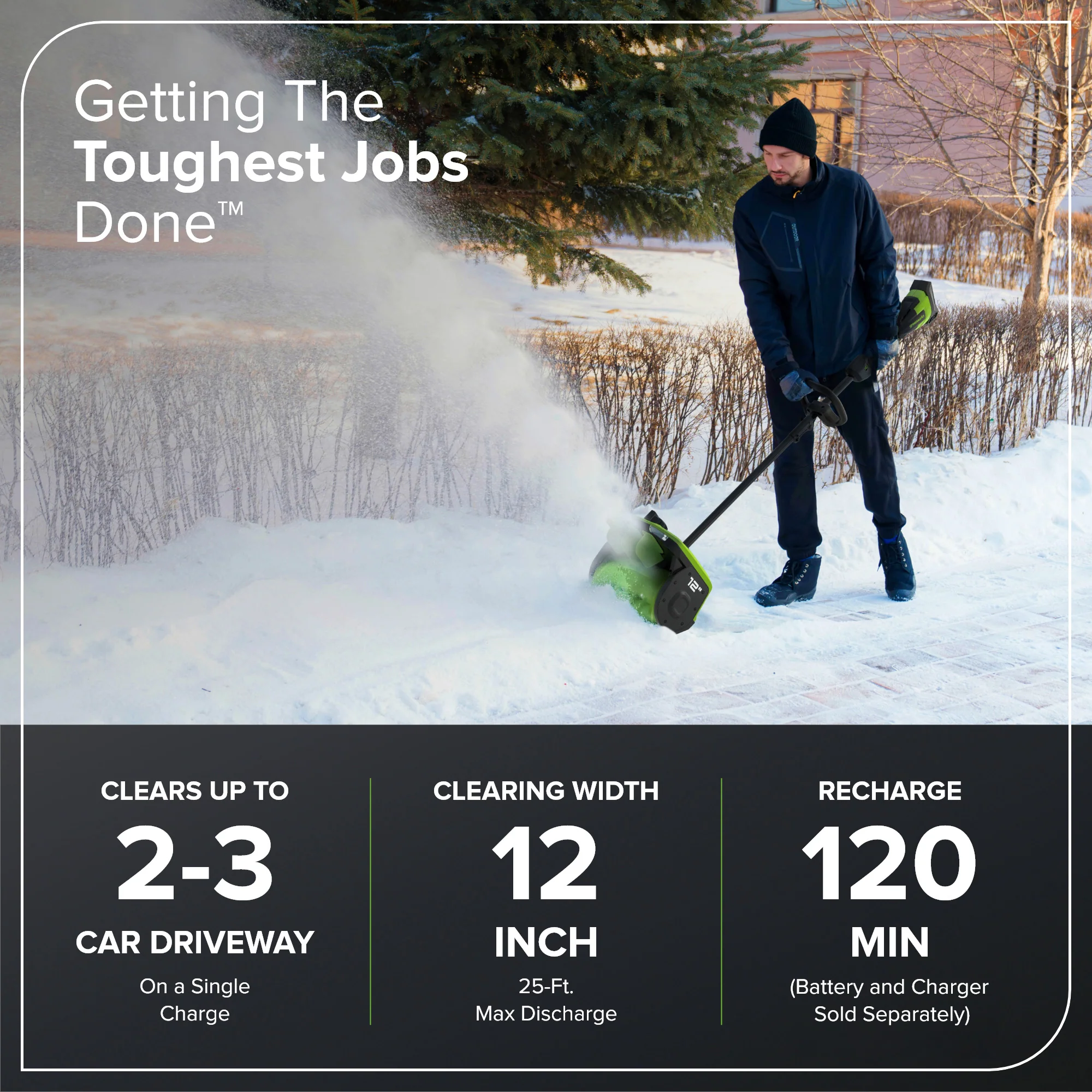 Welcome to a Life. Powered. By Greenworks. Make clearing sidewalks and driveways easier this winter with the 40V 12" Snow Shovel with Directional Vanes. Built with a high-efficiency 1.5kW brushless motor and two-speed impeller providing speeds up to 1800 RPM, this snow shovel is sure to impress. Bright LED lights and quiet operation make it convenient for use early in the morning or late at night. Powered by a 40V lithium-ion battery, it features a clearing width of 12" and a clearing depth of 8”. Say goodbye to gas this winter and hello to Greenworks. This snow shovel is compatible with the complete Greenworks 40V system of tools and batteries. Backed by a 3-year warranty, this snow shovel is built to last for years to come.