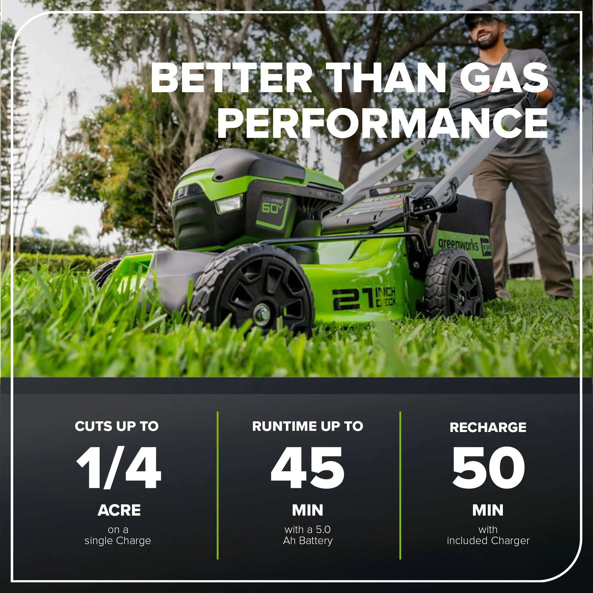 The Greenworks 60V Push Mower features the most advanced power-cutting system in the industry. Where gas mowers bog down, our mowers sense extreme conditions to send optimal power to the blade motors, maintaining consistent blade speeds of 2,800-3,200 RPM through tall, thick, and wet grass. Upgrade to an effortless mowing experience without the hassles of gas. Our eco-friendly battery-powered mowers are 3x quieter than comparable gas units without harmful fumes or pesky maintenance.