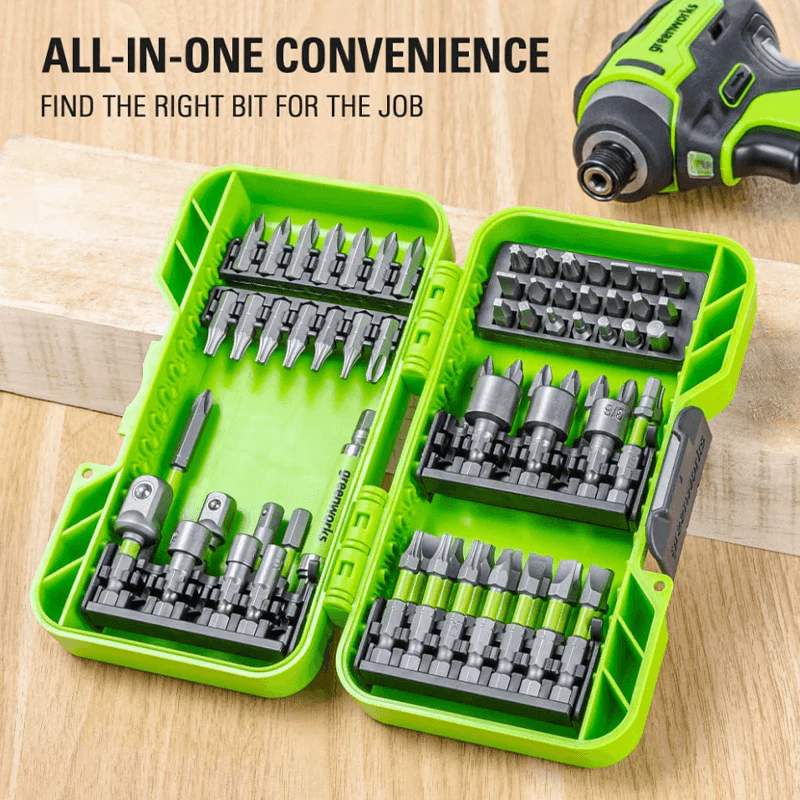 This bit set includes the most used sizes of bits needed for a wide range of tasks. It is compatible with most drills and drivers on the market. Ideal for most DIY projects, home maintenance, and repairs. This set includes a precision-milled bit tip for enhanced fitment with commonly used fasteners. The 2 in. bits feature a torsion zone that absorbs the high torque from more demanding applications and helps to preserve bit tips. It also provides flexibility and durability for extended bit life. Our set includes a magnetic bit holder and two impact socket adaptors for fast and easy switching between sizes, allowing you to pivot quickly between projects. Compatible with most brand drills, electric screwdrivers, and other power tools. Comprehensive, high quality 70 pcs bit set gives all-in-one convenience to users who want accessories conveniently available for everyday tasks. It is a must-have drill and driver bit set in your home garage. The bit set comes with a portable storage case with uncluttered layout for secure storage, easy access, organizing and portability. The green band on bits makes it easier to find on the jobsite and in your toolbox.