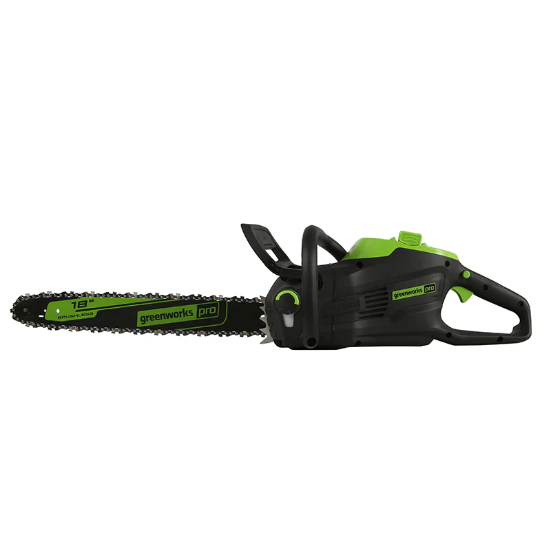 Welcome to a Life. Powered. by Greenworks. Powered by a Greenworks Pro 80V lithium-ion battery, this cordless chainsaw delivers the power and performance of gas without the noise, fumes, or harmful emissions. The high-efficiency brushless motor provides greater torque, longer runtimes, and faster cutting performance, featuring our No Prime, No Choke, No Pull easy-starting system for instant starts every time. This lightweight chainsaw includes an 18-inch bar and chain, pro-style side-mounted chain tensioning for easy maintenance, automatic chain oiler, transparent oil fill window, and a chain brake for added safety. The Greenworks Pro 80V battery platform gives you all the power you need to tackle tough yard projects—so you can kick gas to the curb and go green with no fumes, no mixing, no maintenance, and no pull cords. Backed by a 4-year tool and battery warranty, this chainsaw is built to last.