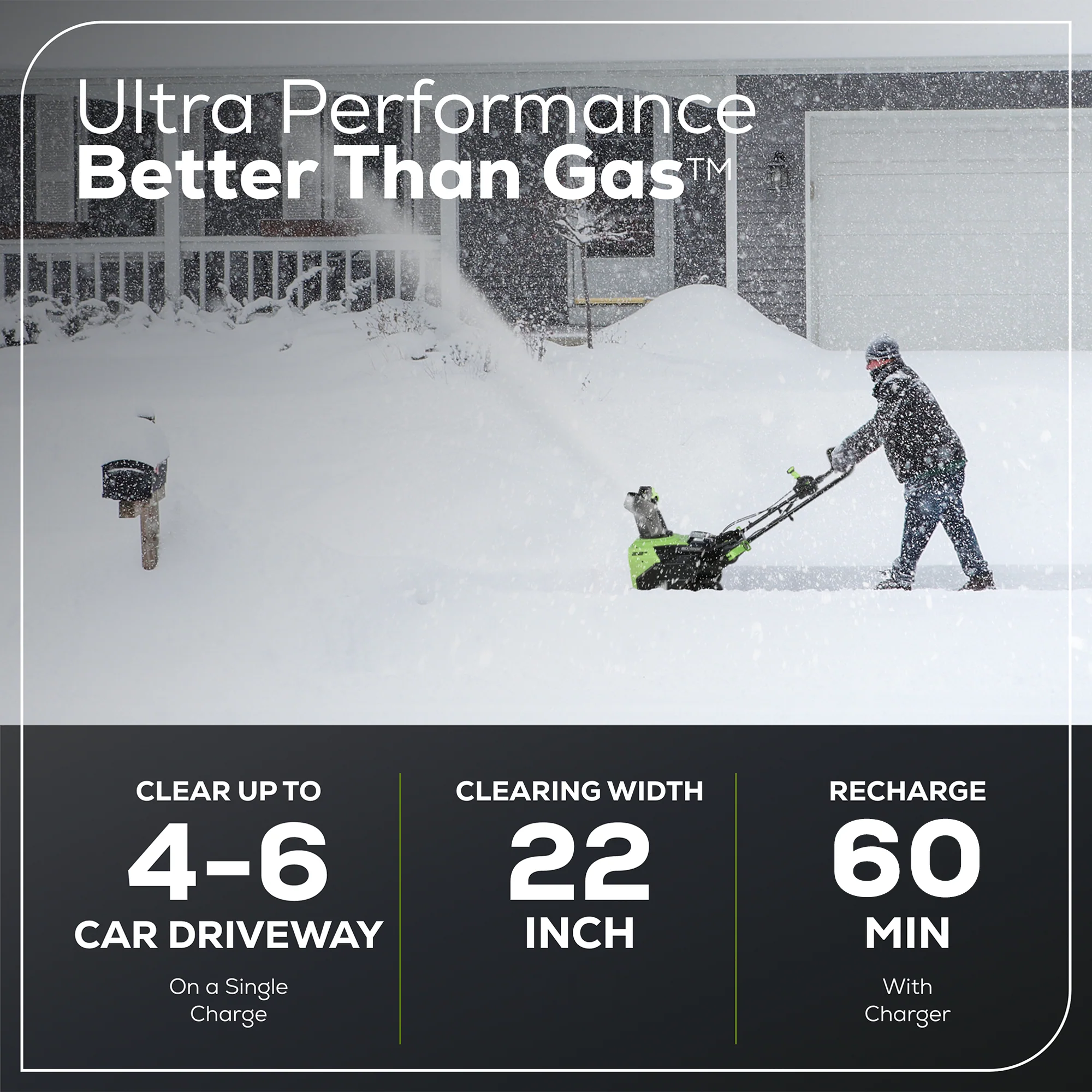 Welcome to a Life. Powered. By Greenworks. Ideal for clearing snow from sidewalks, driveways, and patios, this Greenworks Pro 80V snow blower is the tool to have when the snow hits. Built with a high-efficiency brushless motor and a 22" wide intake, the Greenworks Pro 80V Cordless Snow Blower can handle it all. Easily adjust the auger to control how far the snow is thrown for maximum control. A robust handle-mounted chute-adjustment lever puts the user in control when re-directing the snow up to 180° from side to side. Bright LED lights make it convenient for use early in the morning or at night and the robust steel chassis is built for aggressive use in demanding conditions. Say goodbye to gas this winter and hello to Greenworks. This snow thrower is compatible with the complete Greenworks 80V system of tools and batteries. Start with a tool kit then add tool-only equipment. The Greenworks Pro 80V line is accompanied by a 4-year limited warranty, ensuring the safeguarding of your investment.