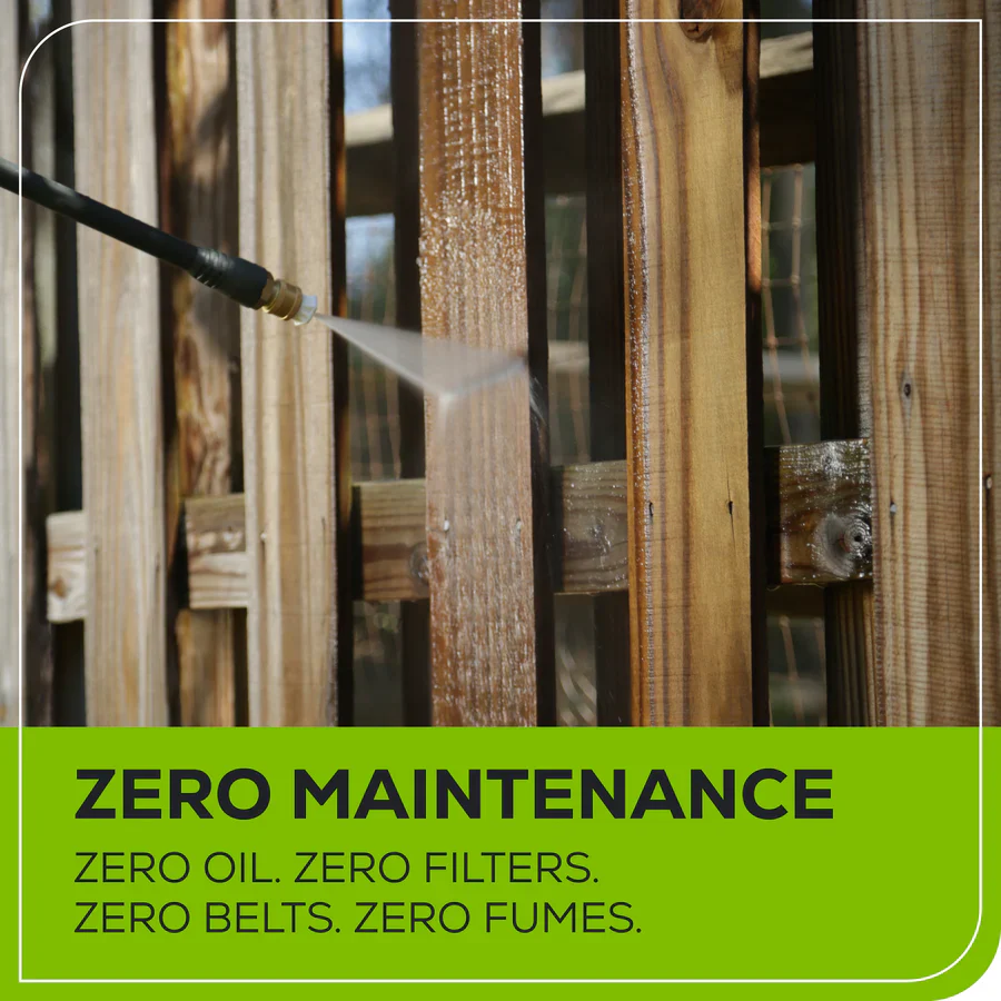 Welcome to a Life. Powered. by Greenworks. The world’s most powerful residential electric pressure washers! This electric power washer is ideal for everyday high-pressure cleaning jobs around the house. Whether it's the car, the house, the deck or the driveway, your stuff is sure to shine. The Greenworks 1800 PSI 1.1-GALLON-GPM Cold Water Electric Pressure Washer is sure to impress. Boasting up to 1.1 GPM of water flow, it's powerful, reliable and built for everyday cleaning. With a hassle-free push-button start, it powers up easily and gets to work fast. It's equipped with an extra-long 35-ft power cord with in-line GFCI and water-resistant power plug, hassle-free kink-resistant hose that eliminates frustrating hose tangles, never-flat wheels for easy transportation, substantial 2-liter on-board soap tank, and on-board accessory storage. Backed by a 3-year tool warranty, it's built to last for years to come.