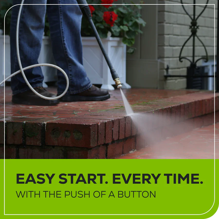 Welcome to a Life. Powered. by Greenworks. The world’s most powerful residential electric pressure washers! This electric power washer is ideal for everyday high-pressure cleaning jobs around the house. Whether it's the car, the house, the deck or the driveway, your stuff is sure to shine. The Greenworks 2000 PSI 1.2-Gallon-GPM Cold Water Electric Pressure Washer is sure to impress. Boasting up to 1.2 GPM of water flow, it's powerful, reliable and built for the toughest cleaning tasks. With a hassle-free push-button start, it powers up easily and gets to work fast. With a rugged metal spray gun, it's tough and durable, and the pump features an anodized coating that's resistant to corrosion. It's equipped with an extra-long 35-ft power cord with in-line GFCI and water-resistant power plug, hassle-free kink-resistant hose that eliminates frustrating hose tangles, never-flat wheels for easy transportation, substantial 2-liter on-board soap tank, and on-board accessory storage. Backed by a 3-year tool warranty, it's built to last for years to come.